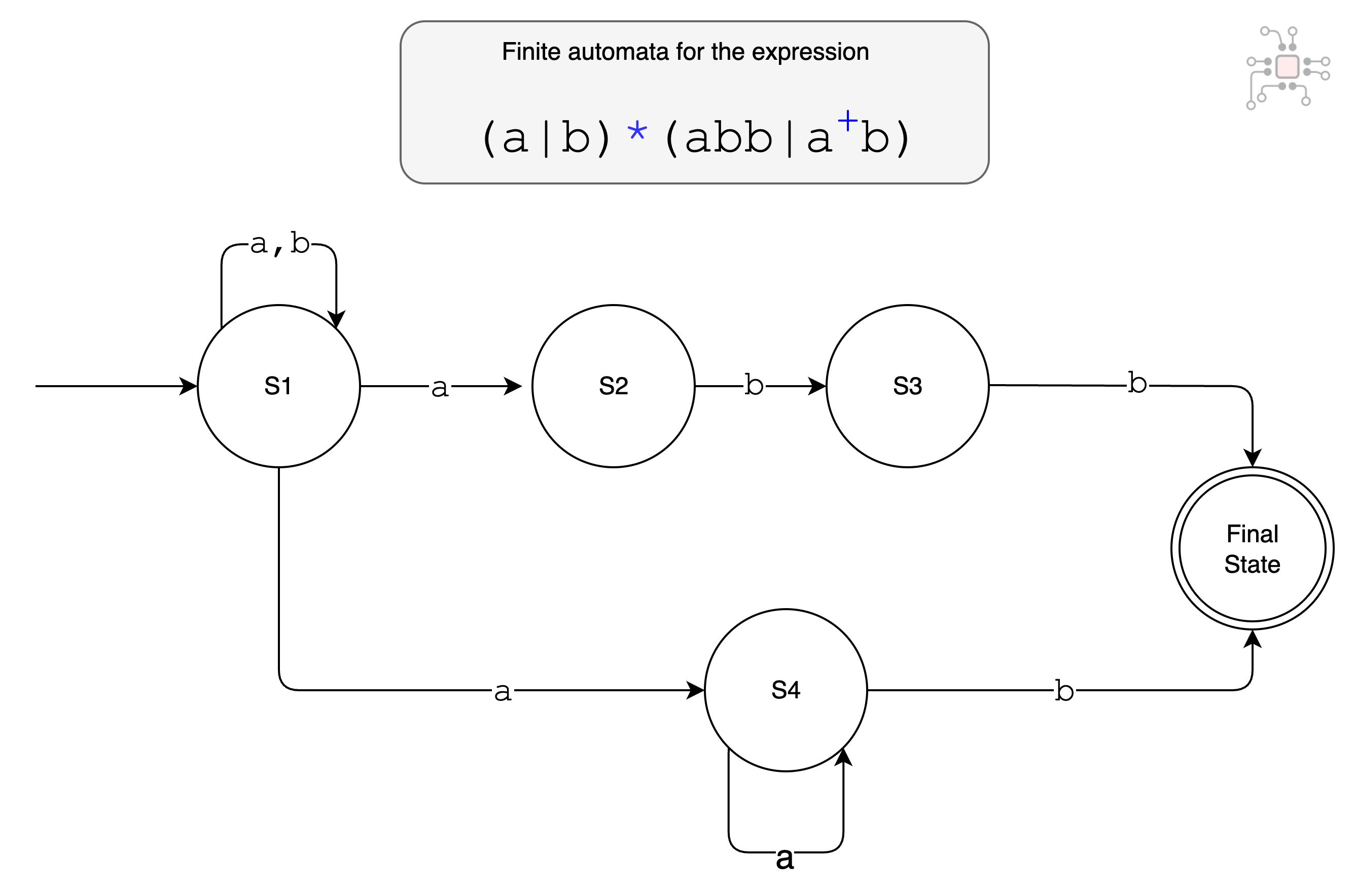 These patterns can be combined into the regular expression (a|b)*(abb|a+b) and when represented as a finite automata, it becomes the following state machine.
