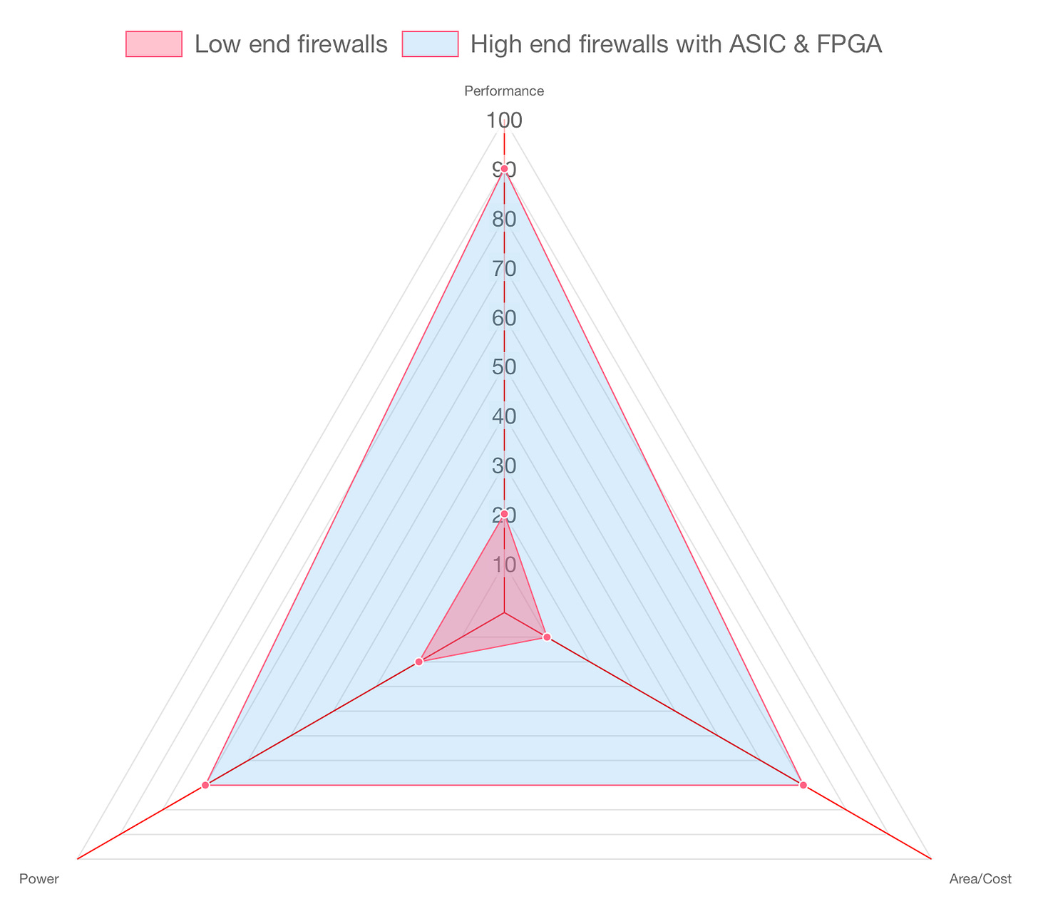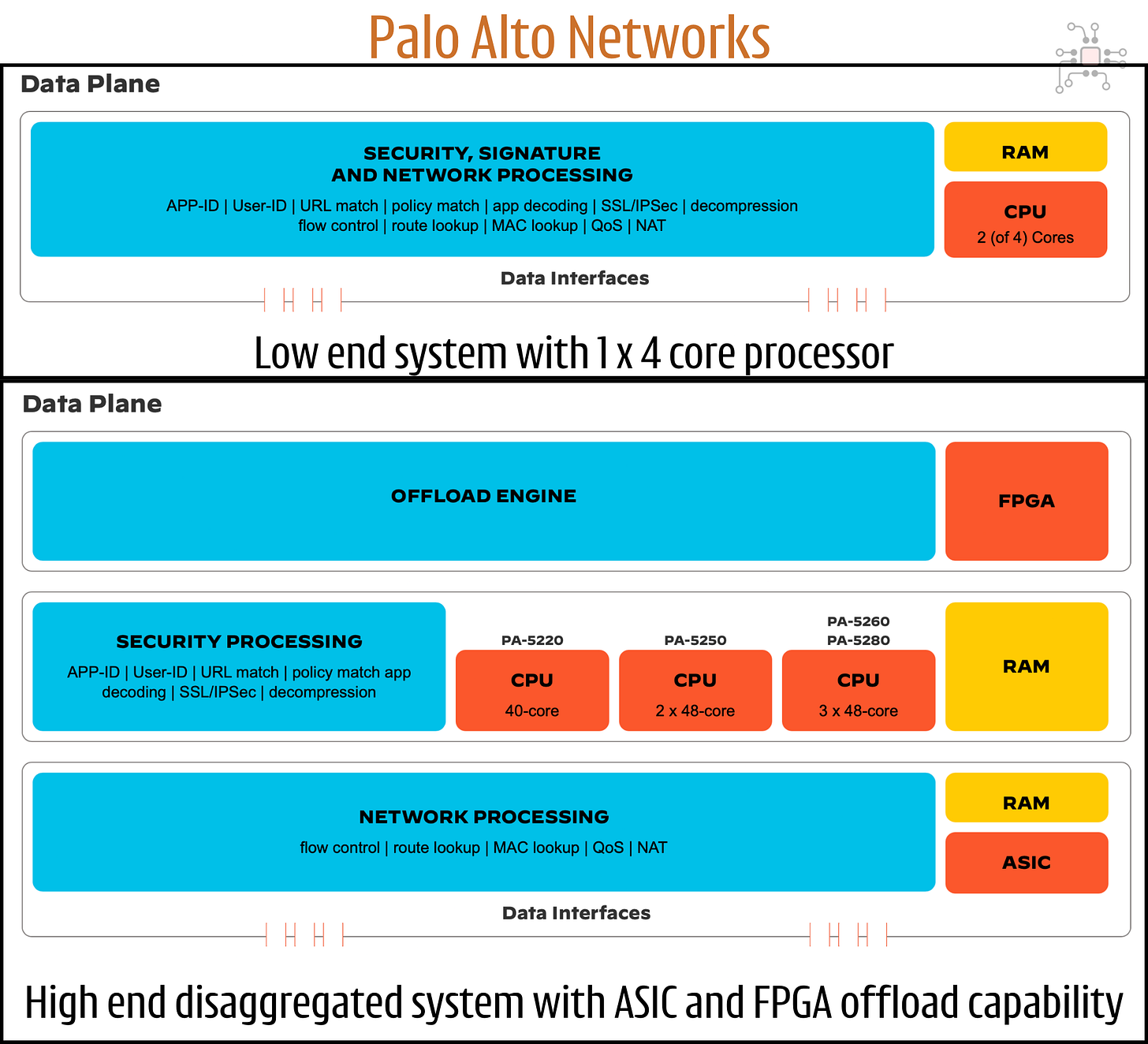 The image below is from the Palo Alto Networks website. It shows how a high-end system has an ASIC in the front-end to ingest traffic and a FPGA at the back-end to offload expensive compute off the processors running the firewall software.