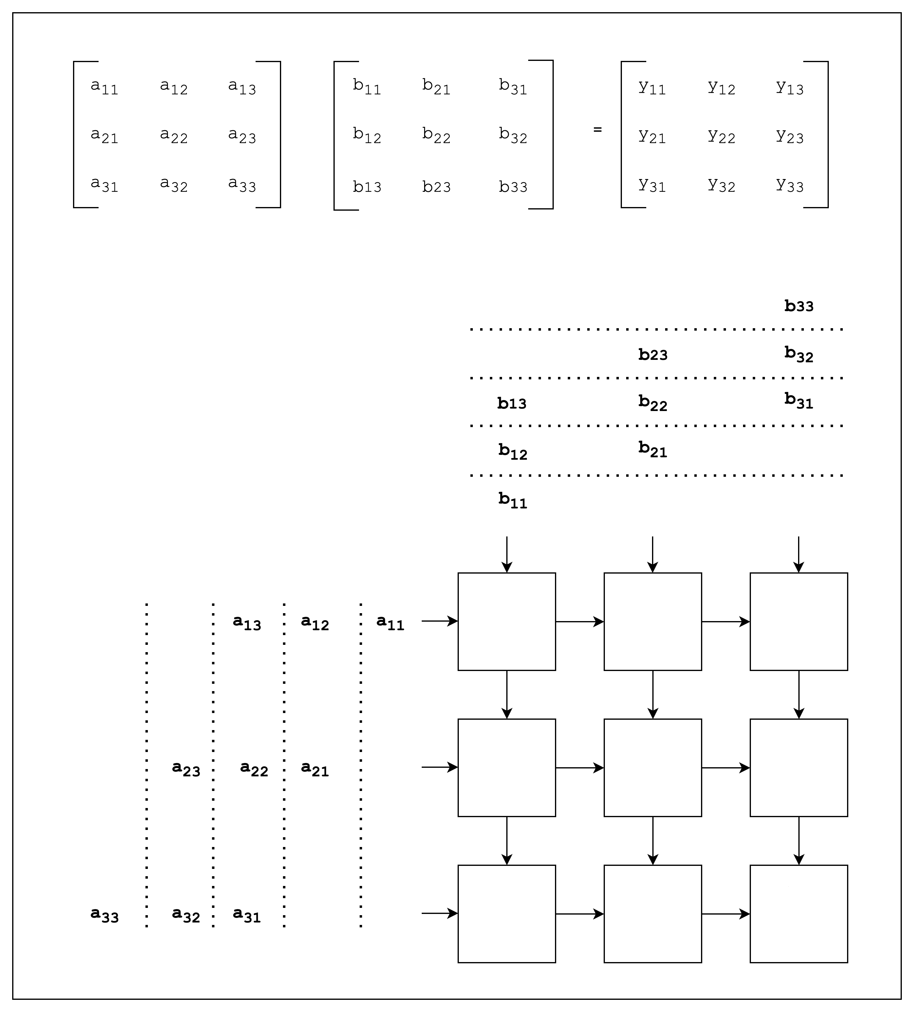 It relies on data from different directions arriving at cells in an array at regular intervals where they are combined. Figure 4 shows that data flows in from the left, and the weights are loaded from the top.