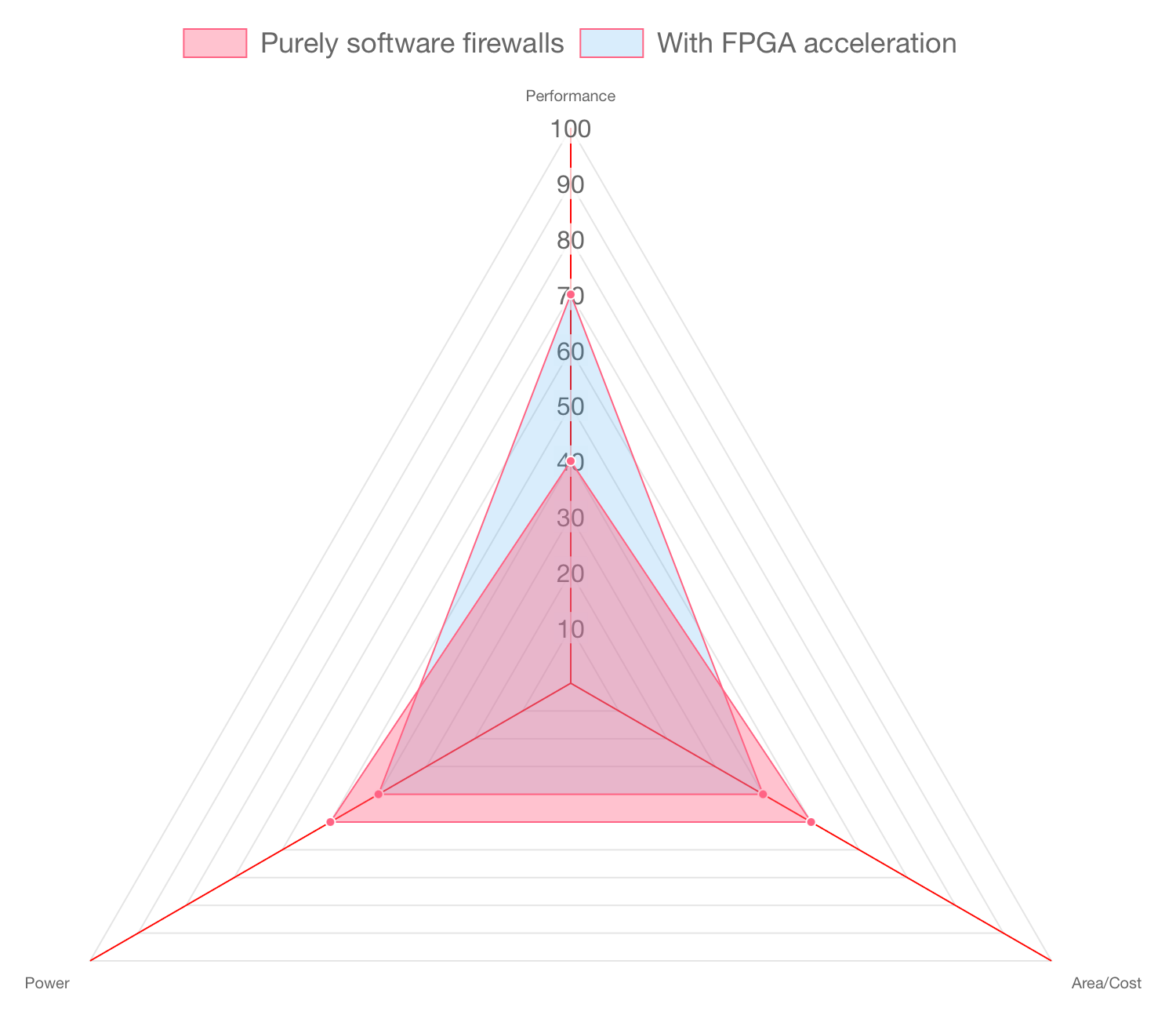 Performing these hash calculations and pattern matches on every single packet is expensive. Purely software firewalls running on general-purpose processors will not scale beyond a certain bandwidth, say 20Gbps. Instead, an alternative is to offload such frequent computations to a FPGA, which can perform the same computation in a fraction of the time than software would take.1
