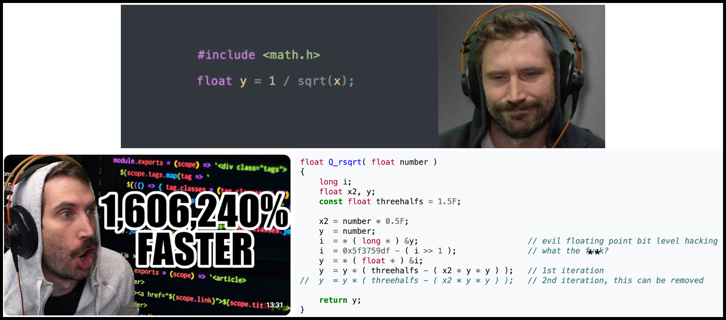 In 3D games, like Quake, it was required to compute 1/√x repeatedly for each point to determine lighting and reflections on surfaces. On early Intel processors, doing this calculation through repeated division operations was very slow. John Carmack famously replaced this code with the Fast Inverse Square Root, which was discovered by Quake III Arena fans when id software made the game open-source. This is the Gamer’s Accelerator.