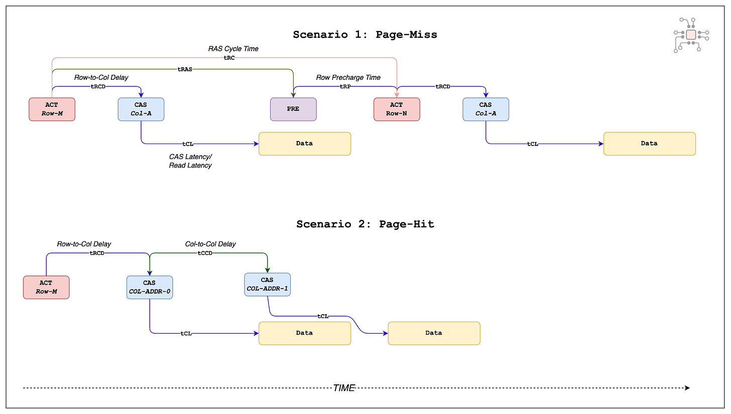 In scenario 1, since the relevant data is located in 2 different rows, after the first row is accessed it has to be deactivated, and the second row has to go through the activation process all over again. This scenario is also called a Page Miss.