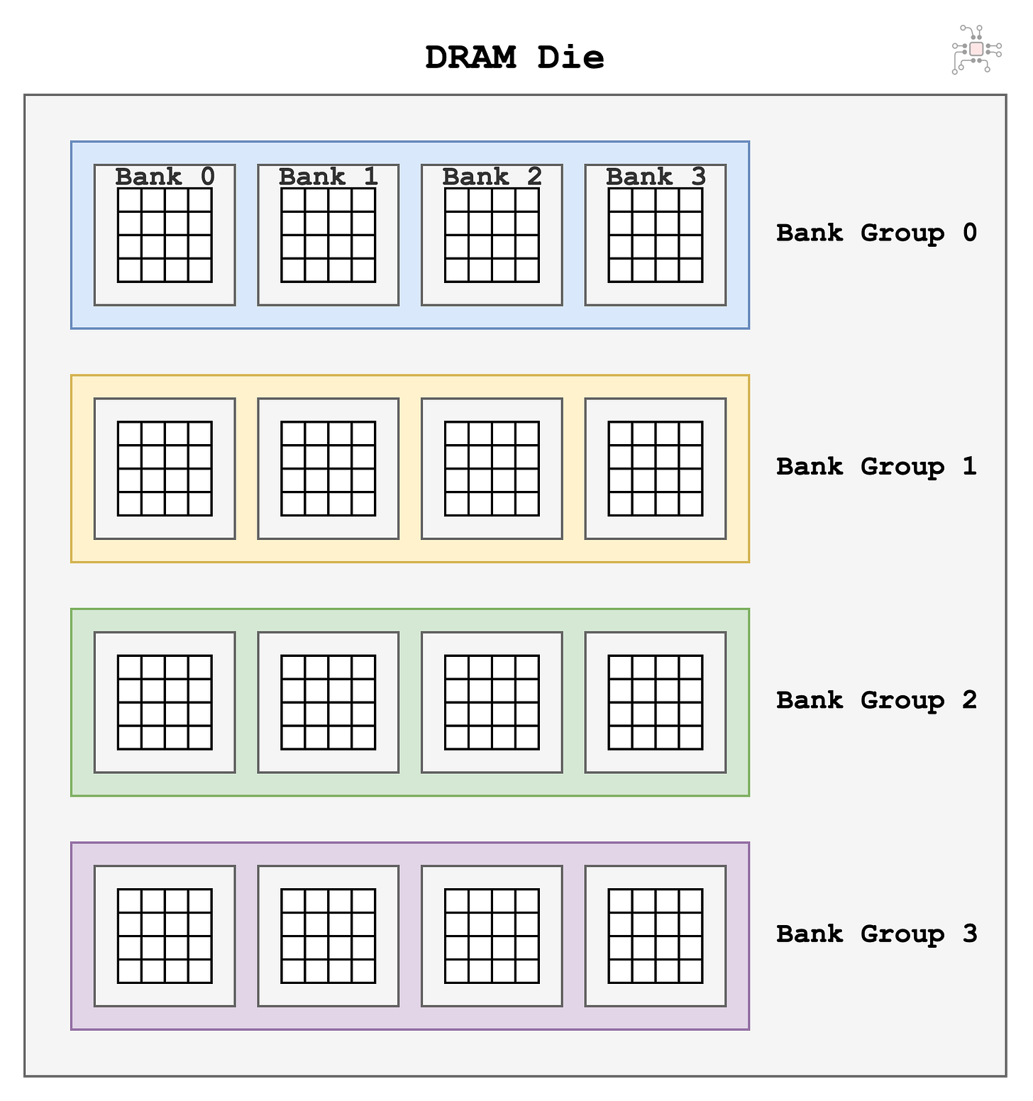 Fortunately for us, the DRAM die is made up of not just one bank but a collection of banks, which are arranged in Bank Groups. Next, we'll look at how bank groups help us improve performance.