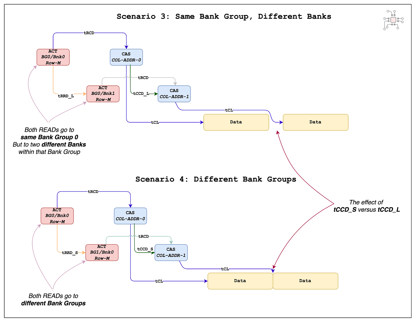 In scenario 3, since the back-to-back reads go to different banks of the same bank group, the two reads have to be separated by the tCCD_L (Column-to-column-Long) timing parameter. (Which is 4 clock cycles in LPDDR5).