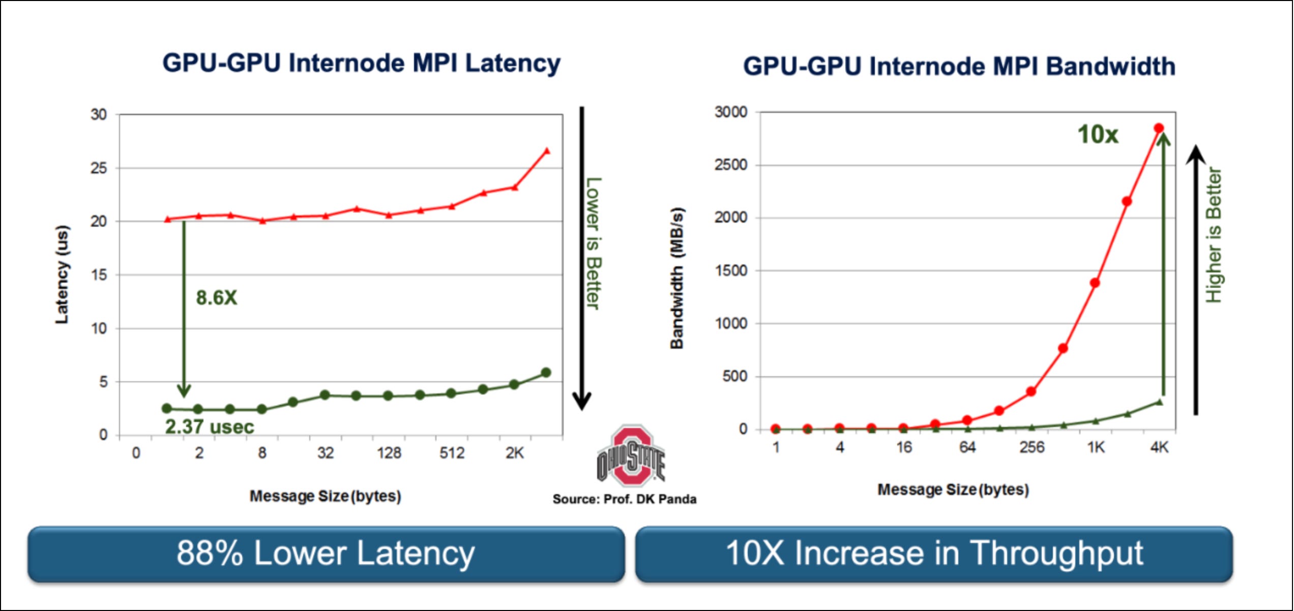 Once again, the change to MPI looks deceptively simple but the implications and work involved to enable it were profound. In 2013, the MPI core developers presented this update publicly, showing concrete improvements in both latency and throughput enabled by GPUDirect RDMA. It’s well worth watching that presentation to understand just how significant the shift was.