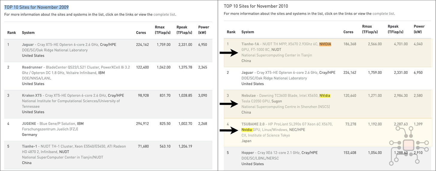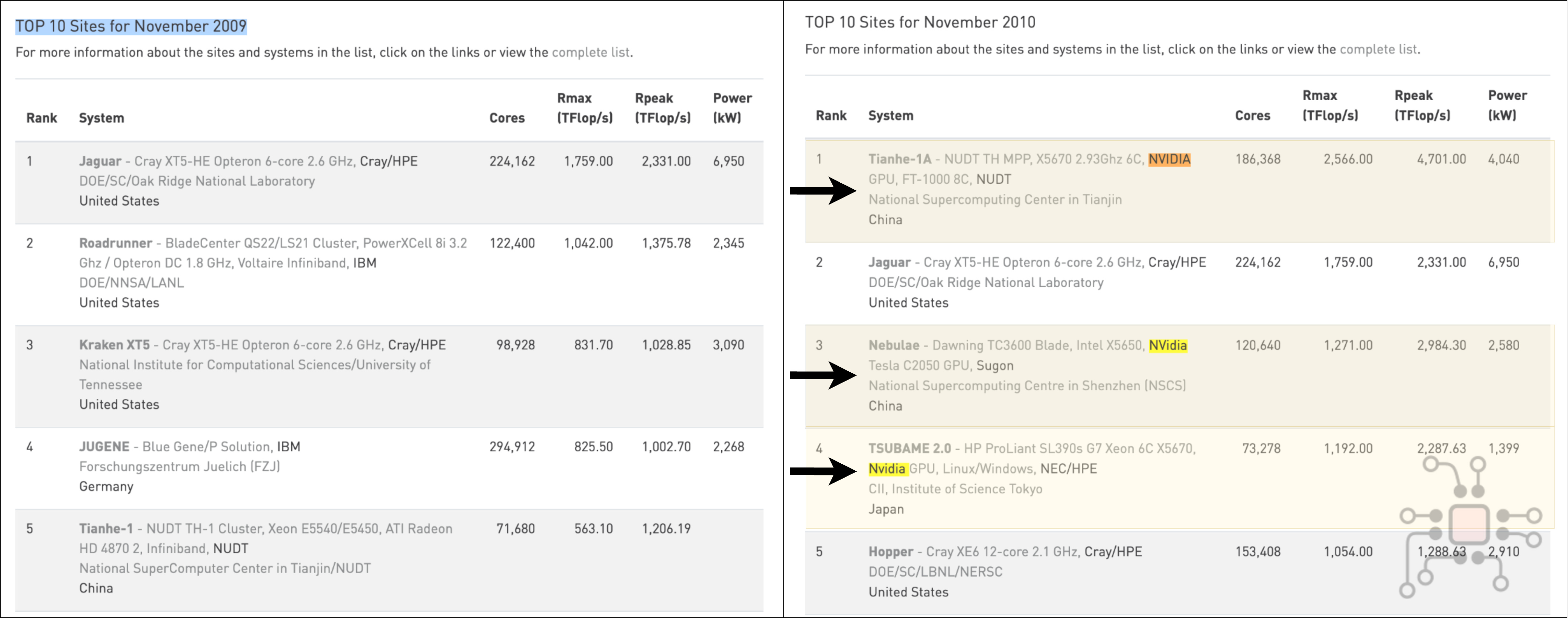What’s remarkable isn’t just that China took the top position — it’s how quickly the underlying architecture shifted. If you compare the Top 5 supercomputers from November 2009 to November 2010, we see that in the span of a single year, three of the top five supercomputers are now GPU-accelerated, using NVIDIA GPUs.