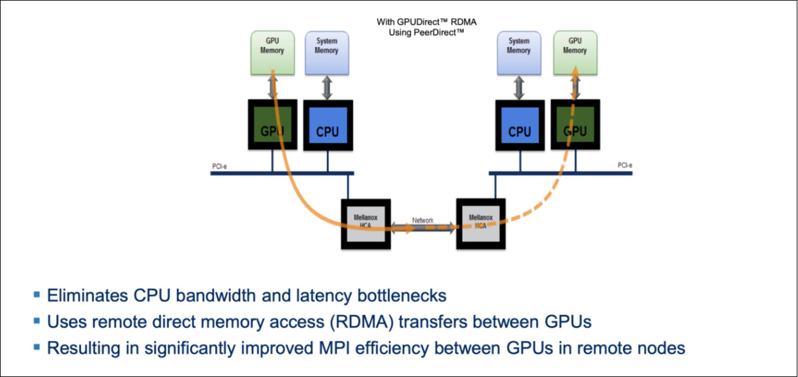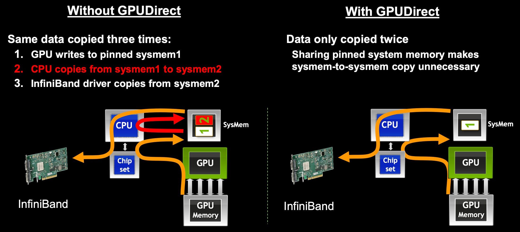 Before GPUDirect RDMA, the MPI code had to copy over data from the GPU to the CPU’s memory using cudaMemCpy(*gpu_mem_ptr, *host_mem_ptr), and then sent the data to the peer using MPI_Send(*host_mem_ptr).