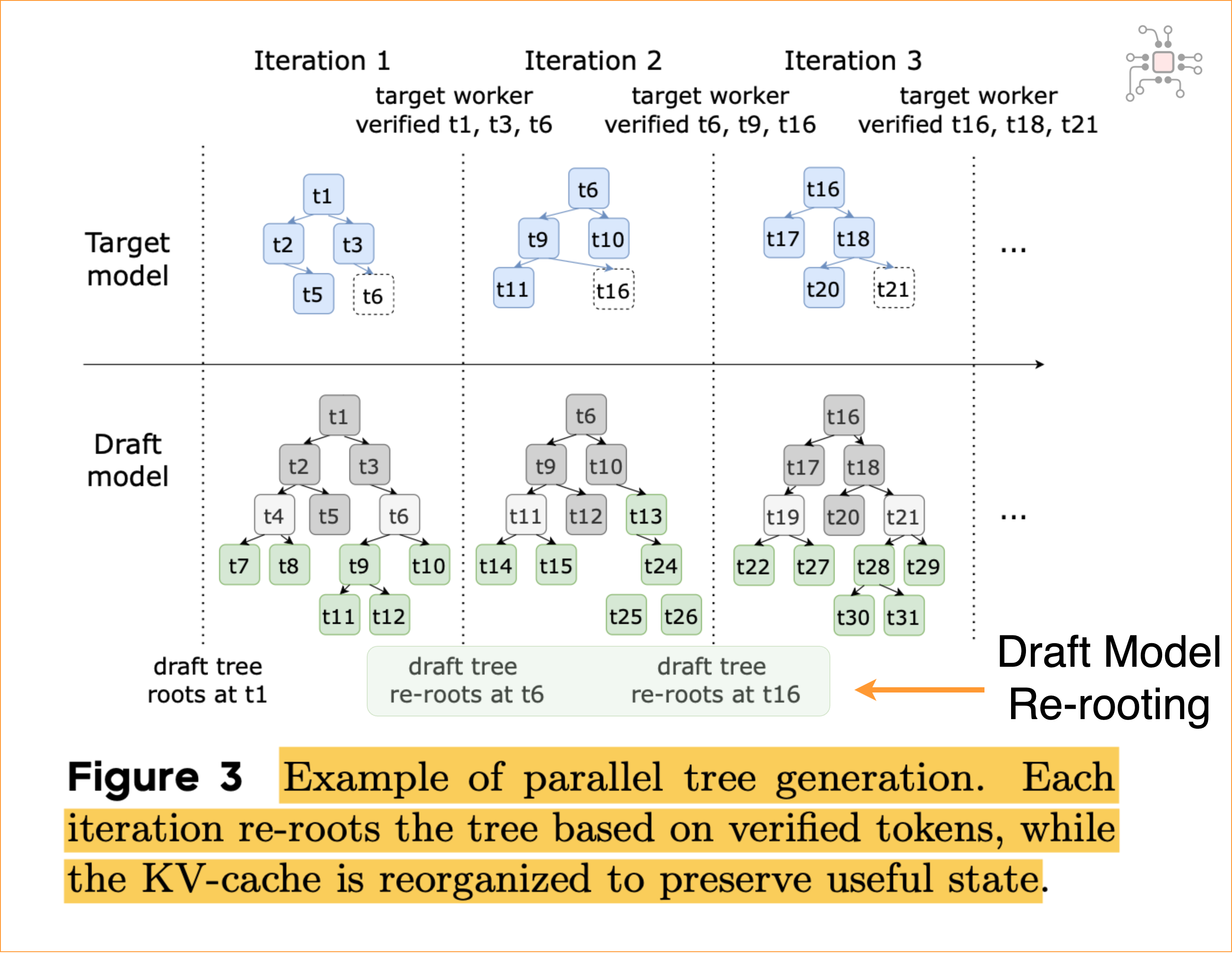 They also developed a novel scheme to let the two models run asynchronously. The draft model generates a tree of tokens and can move ahead and generate candidate tokens for the next iteration while the target stage is still verifying the previous one. After each step, the two models synchronize state, and the draft “re-roots” by keeping only the portion of its token tree that the target has verified. This is represented in the figure below.