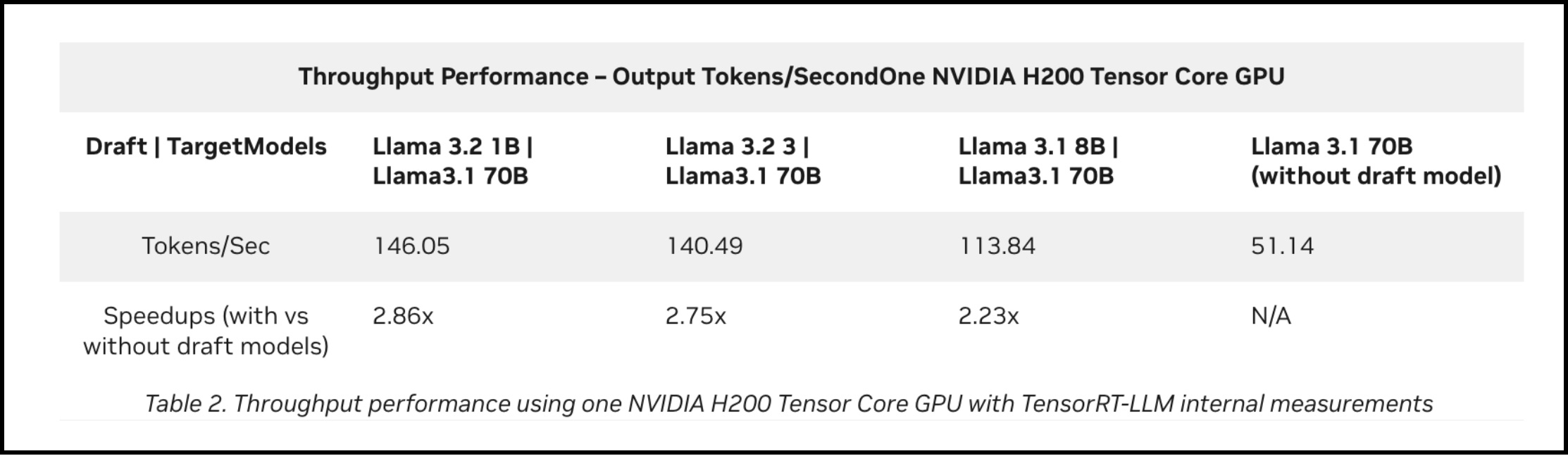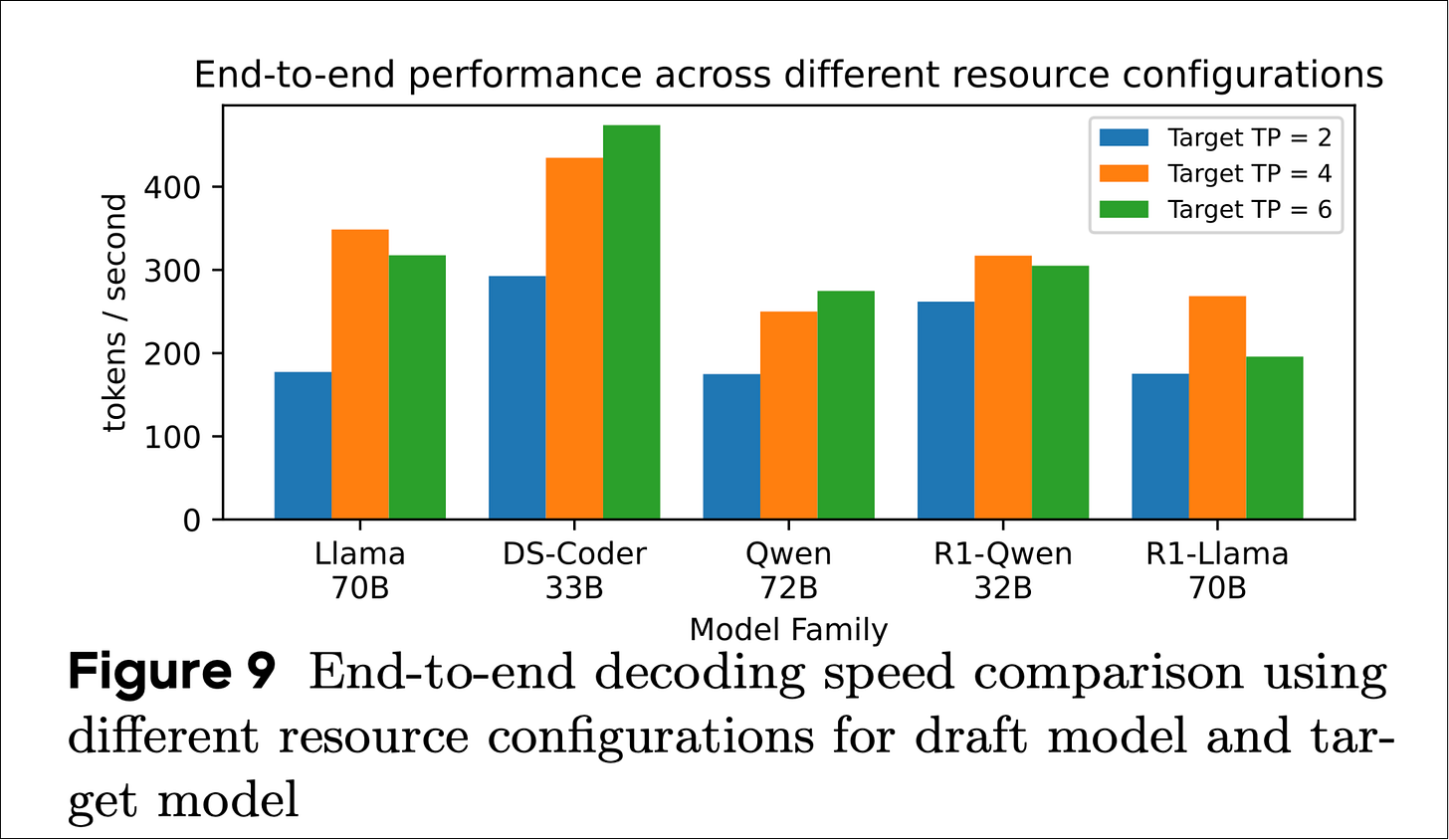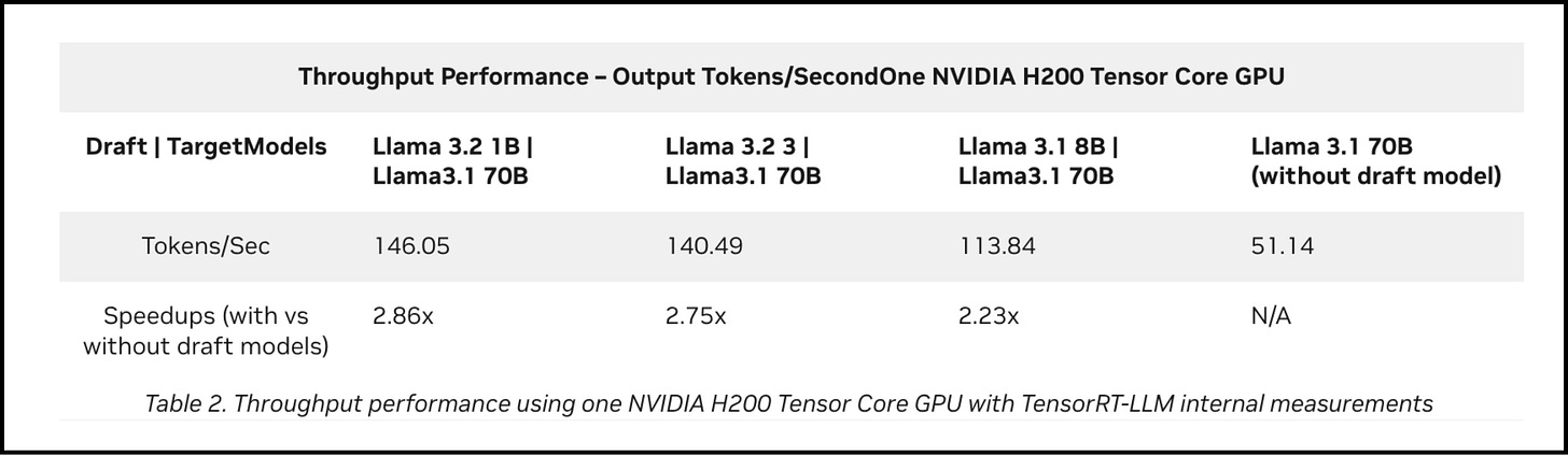 Llama-70B on one Hopper H200 yields about 51 tokens/sec without speculative decoding. But when they pair it with a tiny Llama-1B draft model, still on the same GPU, the throughput jumps to about 146 tokens/sec.