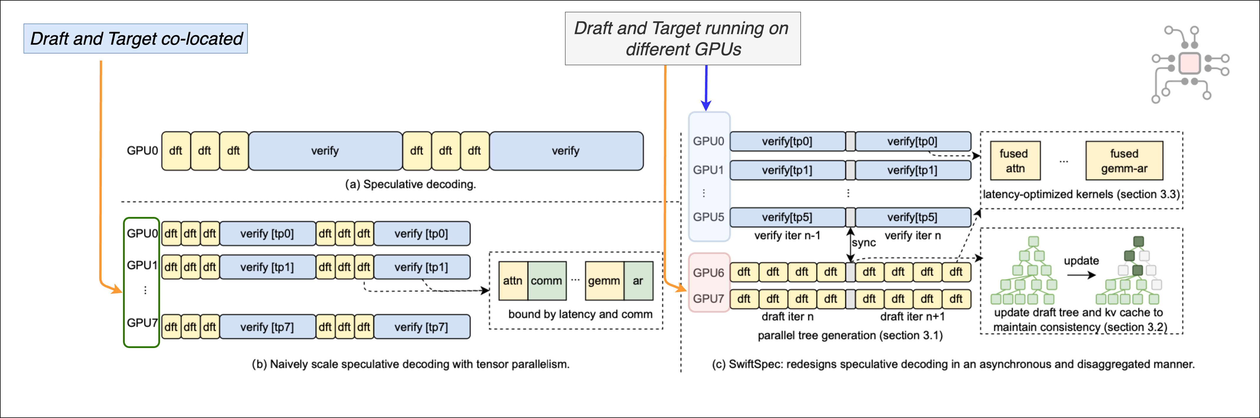 Second, large target models usually require multiple GPUs with model parallelism. Earlier deployments often co-located draft and target, and then tried to scale them both the same way across GPUs. SwiftSpec points out why this is inefficient in small-batch serving. The draft and target have very different compute needs, and when you force both through the same tensor-parallel setup, you run into compute imbalance, KV cache consistency issues, and communication overhead that is hard to amortize at low batch sizes.