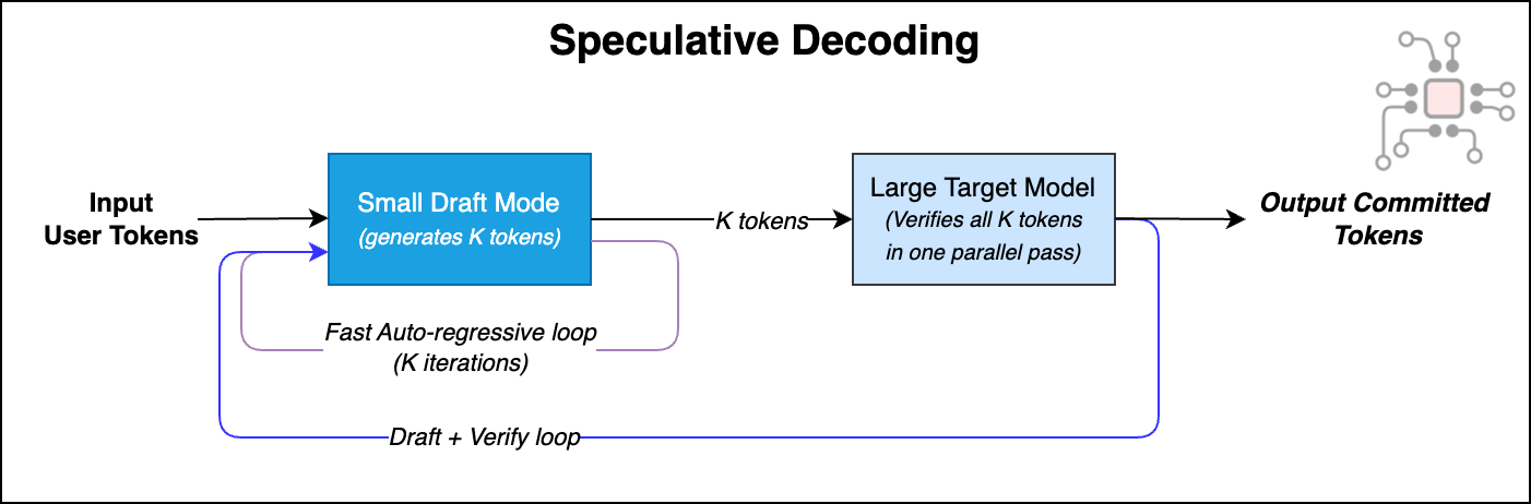 Then the process repeats. Draft a few more tokens, verify the next chunk, commit what’s accepted. This draft → verify loop continues until the full response is generated.
